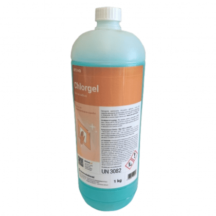 CHLORGEL: Detergente igienizzante cloroattivo gelificato. Unisce alla capacità detergente del formulato anche la capacità igienizzante e sbiancante del cloro. Schiarisce le superfici e le fughe delle piastrelle in cucine, bagni, docce, ecc. *Idoneo per piani HACCP*