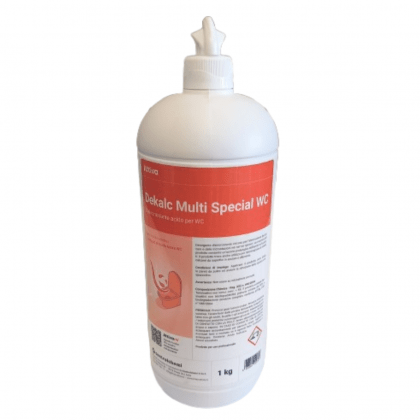 DEKALC MULTI SPECIAL WC: Detergente disincrostante viscoso per l'eliminazione del calcare e delle incrostazioni nei servizi igienici. La viscosità del prodotto consente un'azione prolungata dell'acido sulle pareti. Il prodotto trova anche utilizzo per l'emilinazione di residui calcarei da superfici in acciaio e alluminio.